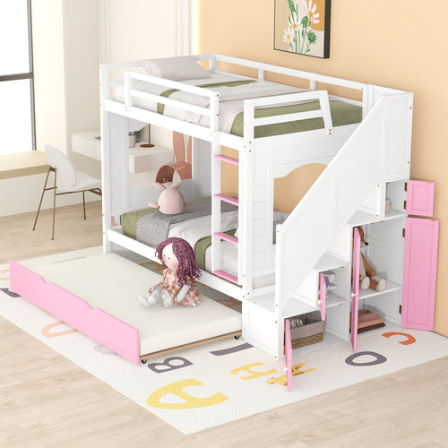 iRerts Twin Over Twin Bunk Bed with Trundle, Solid Wood Bunk Beds Twin over Twin with Storage Cabinet, Stairs and Ladders, Twin Bunk Beds for Kids Teens Bedroom, White/Pink