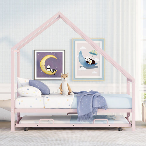 iRerts Twin Size Metal House Bed Frame with Trundle, Modern Twin Platform Bed Frame with Metal Slats, Twin Bed Frame No Box Spring Needed, Twin Size Bed Frame for Kids Bedroom, Pink