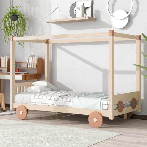 iRerts Wood Twin Size Canopy Bed, Car-Shaped Twin Platform Bed Frame for Kids Toddlers Boys Girls, Cute Kids Twin Bed Frame with Slats Support for Kids Bedroom, No Box Spring Needed, Natural