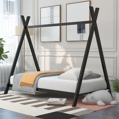 Twin Size House Bed Frame for Kids Toddlers, Twin Platform Bed with 20 Slats for Girls Boys Room, Floor Bed No Box Spring Needed, Black