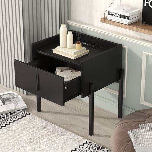 iRerts Side Table with Charging Station, Wood Nightstand with Drawer, USB Charging Ports and Black Handle, Modern Storage Bedside Table End Table for Bedroom Living Room, Black