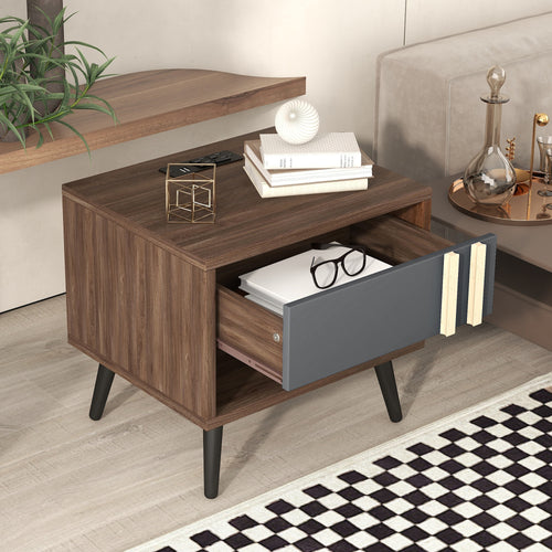 iRerts Side Table with Charging Station, Wood Nightstand with Drawer, USB Charging Ports and Black Handle, Modern Storage Bedside Table End Table for Bedroom Living Room, Walnut