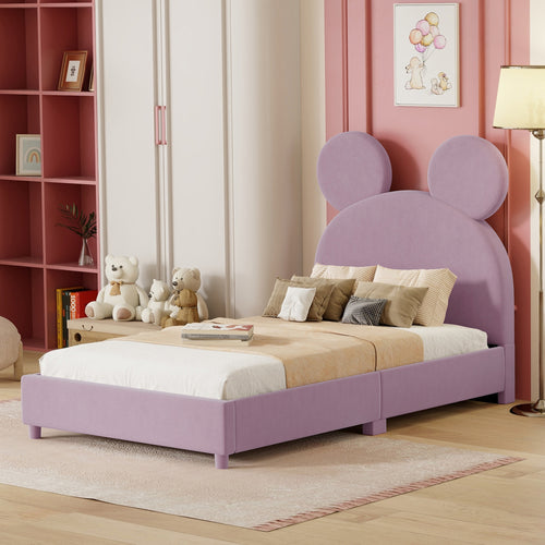iRerts Twin Bed Frame, Modern Velvet Upholstered Platform Bed Frame with Bear Ear Shaped Headboard, Wooden Slat, Twin Size Low Platform Bed for Kids Boys Girls Bedroom, No Box Spring Needed, Pink